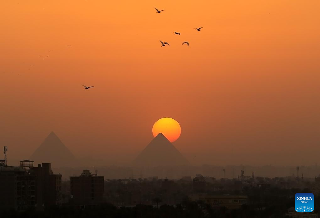 This photo taken on April 19, 2025 shows the Giza Pyramids at sunset seen from Cairo, Egypt. (Xinhua/Wang Dongzhen)