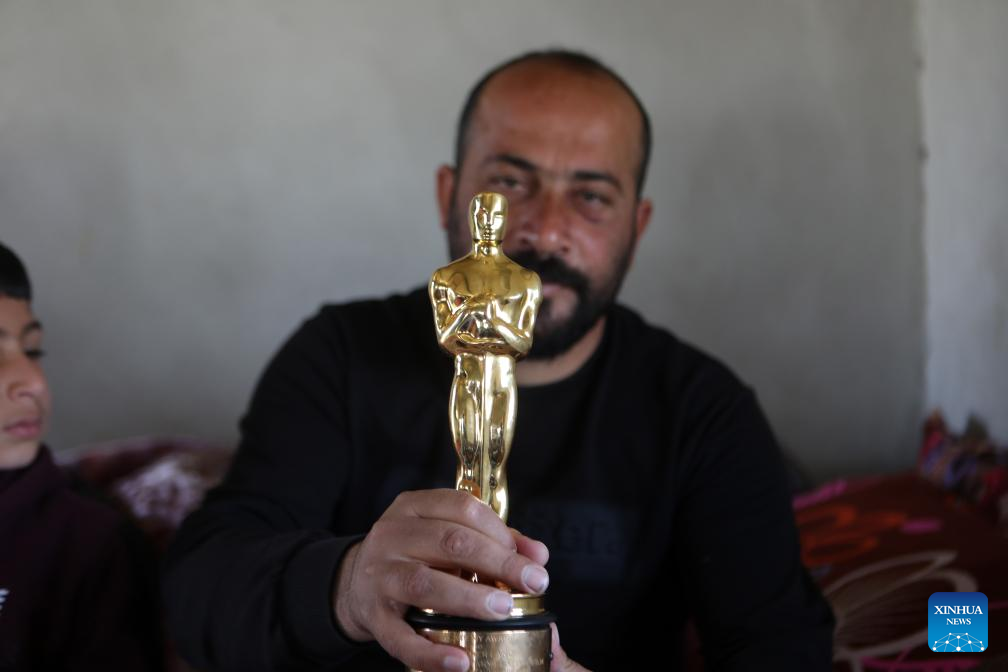 Palestinian filmmaker Hamdan Ballal, co-director of the Oscar-winning documentary "No Other Land," holds his Oscar statuette at his house in the village of Susya in Masafer Yatta, south of Hebron, on March 26, 2025. Palestinians' bond with their land runs deep and they will never leave home even at a time of hardship and increasing Israeli settler violence, said Hamdan Ballal, co-director of the Oscar-winning documentary "No Other Land." "No Other Land" chronicles the violence facing Palestinian villagers and Israeli demolitions of Palestinian homes in the area of Masafer Yatta, southern West Bank. It has notched up festival awards and the Oscar for best documentary feature this year. (Photo by Mamoun Wazwaz/Xinhua)