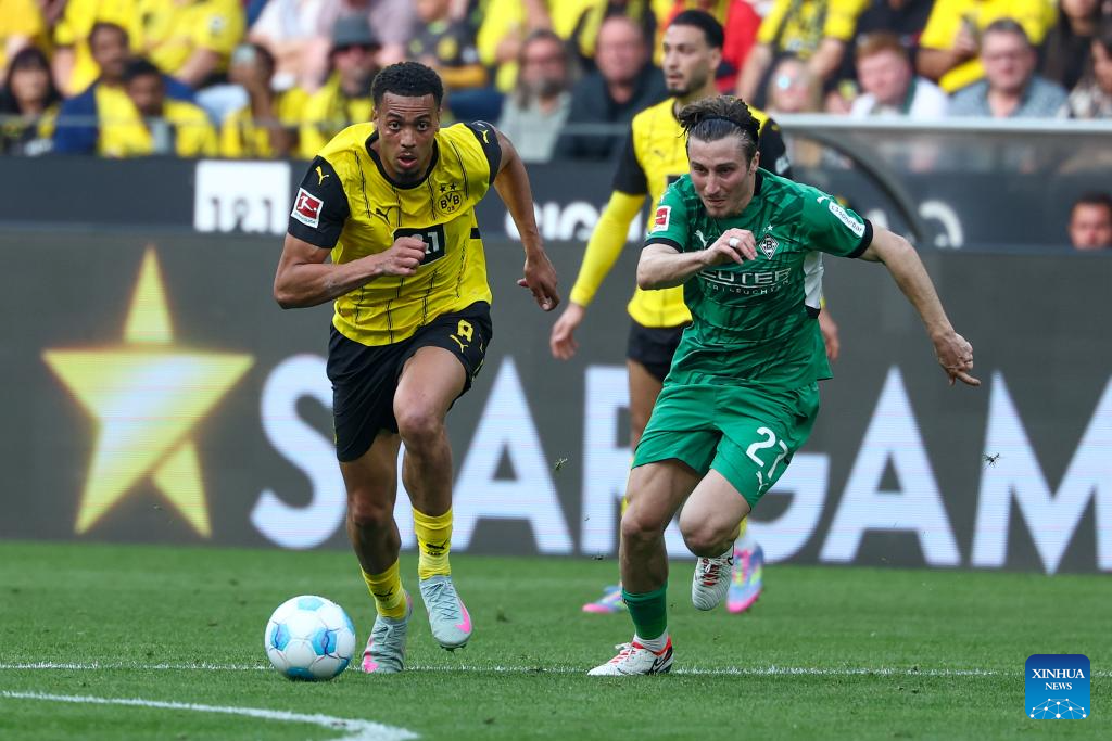 (250421) -- DORTMUND, April 21, 2025 (Xinhua) -- Felix Nmecha (L) of Borussia Dortmund vies with Rocco Reitz of Borussia Moenchengladbach during the first division of Bundesliga football match between Borussia Dortmund and Borussia Moenchengladbach in Dortmund, Germany, April 20, 2025. (Photo by Joachim Bywaletz/Xinhua)