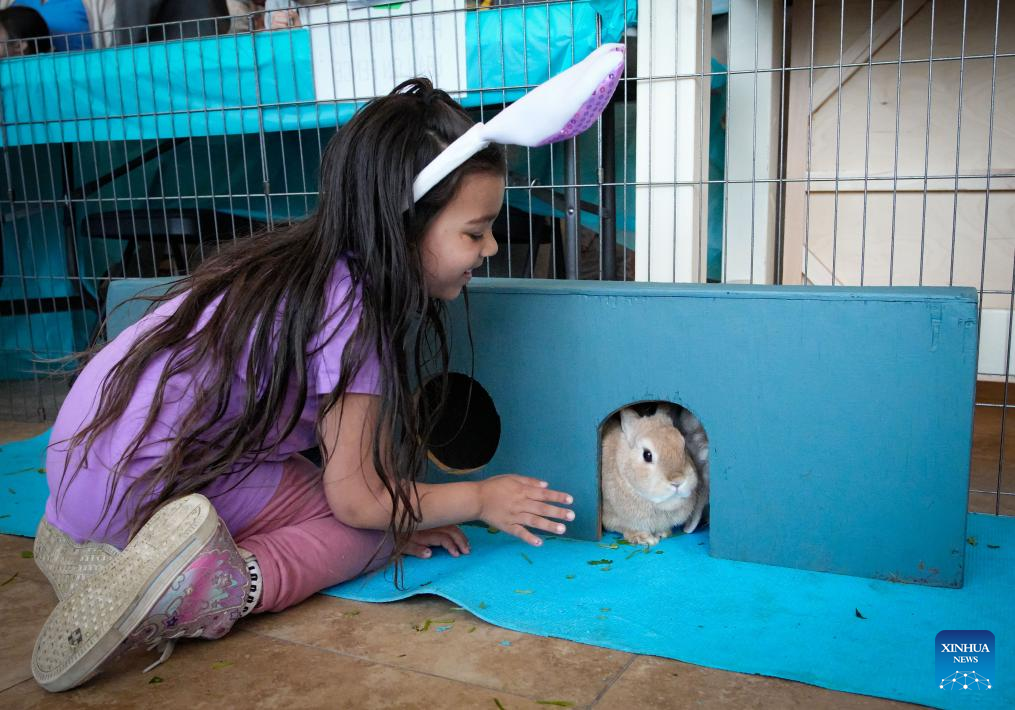 A girl interacts with a rabbit during the Easter Bunny Fest event in Richmond, British Columbia, Canada, April 20, 2025. A family-friendly event featuring "meet and treat" interaction with bunnies rescued by a local animal welfare charity was held here in celebration of Easter. (Photo by Liang Sen/Xinhua)