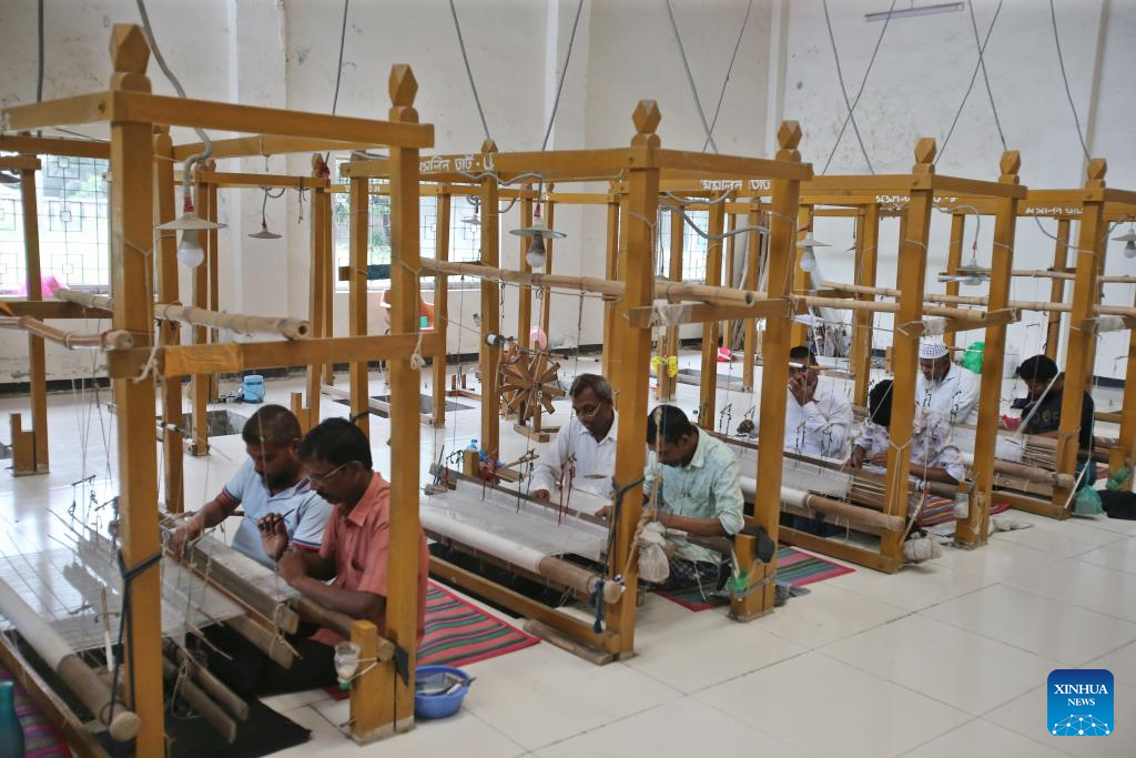 Workers spin cotton into thread to craft traditional muslin garments at a workshop in Narayanganj, Bangladesh, April 19, 2025. (Photo by Habibur Rahman/Xinhua)