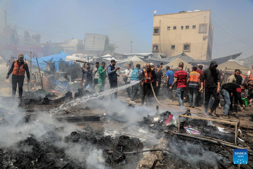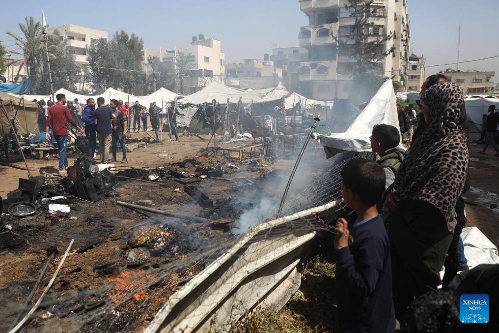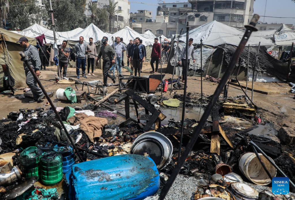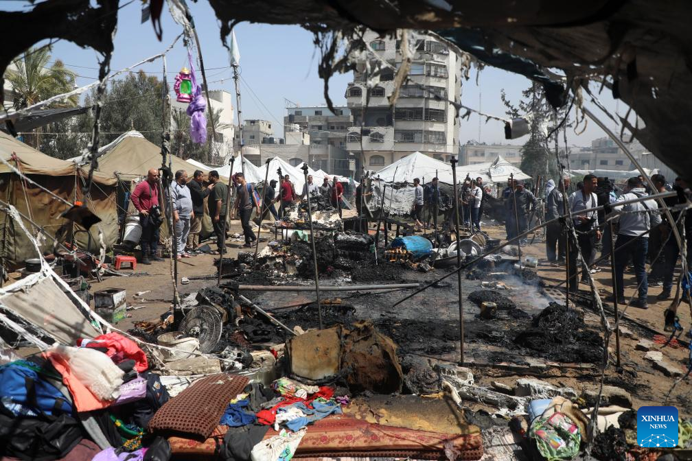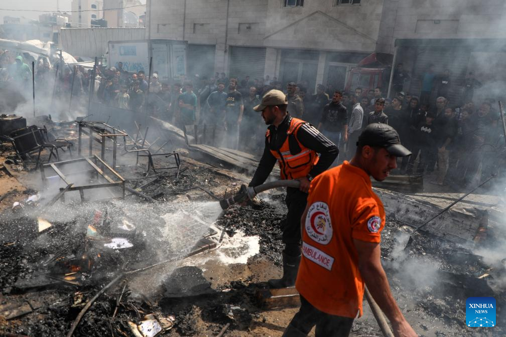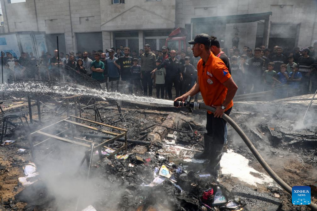Firefighters put out a fire after an Israeli airstrike in Gaza City, on April 21, 2025. Israel's military said on Monday that it carried out more than 200 airstrikes across the Gaza Strip over the past three days, killing a member of the Islamic Jihad movement. (Photo by Rizek Abdeljawad/Xinhua)