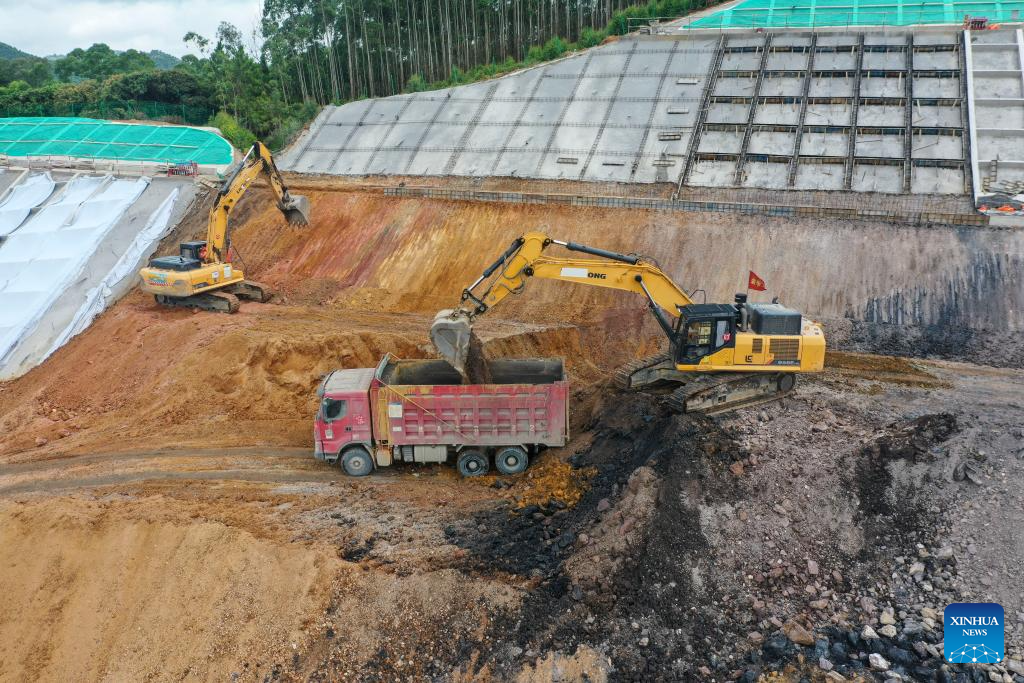 An aerial drone photo taken on July 1, 2023 shows excavators produced by an equipment manufacturing company in Liuzhou working at the construction site of Pinglu Canal in Qinzhou, south China's Guangxi Zhuang Autonomous Region. (Xinhua/Cao Yiming)