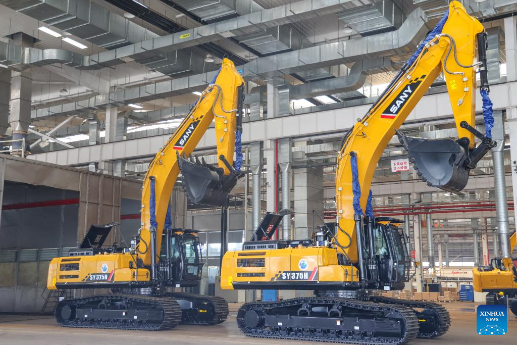 Staff members work on an assembly line of excavators for export to Laos and Myanmar at an equipment manufacturing company in southwest China's Chongqing Municipality, April 21, 2025. (Xinhua/Huang Wei)