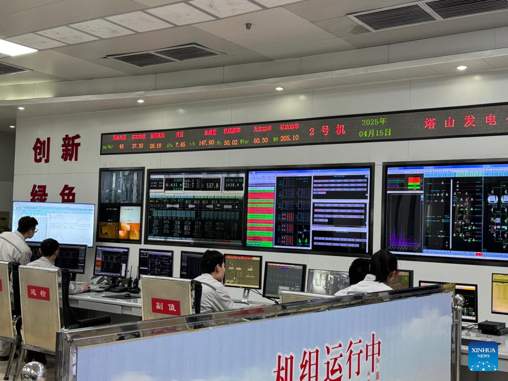 Staff members monitor and adjust the operation of facilities at the control room of the Tashan power plant in Datong, north China's Shanxi Province, April 15, 2025. (Xinhua/Wang Xuetao)