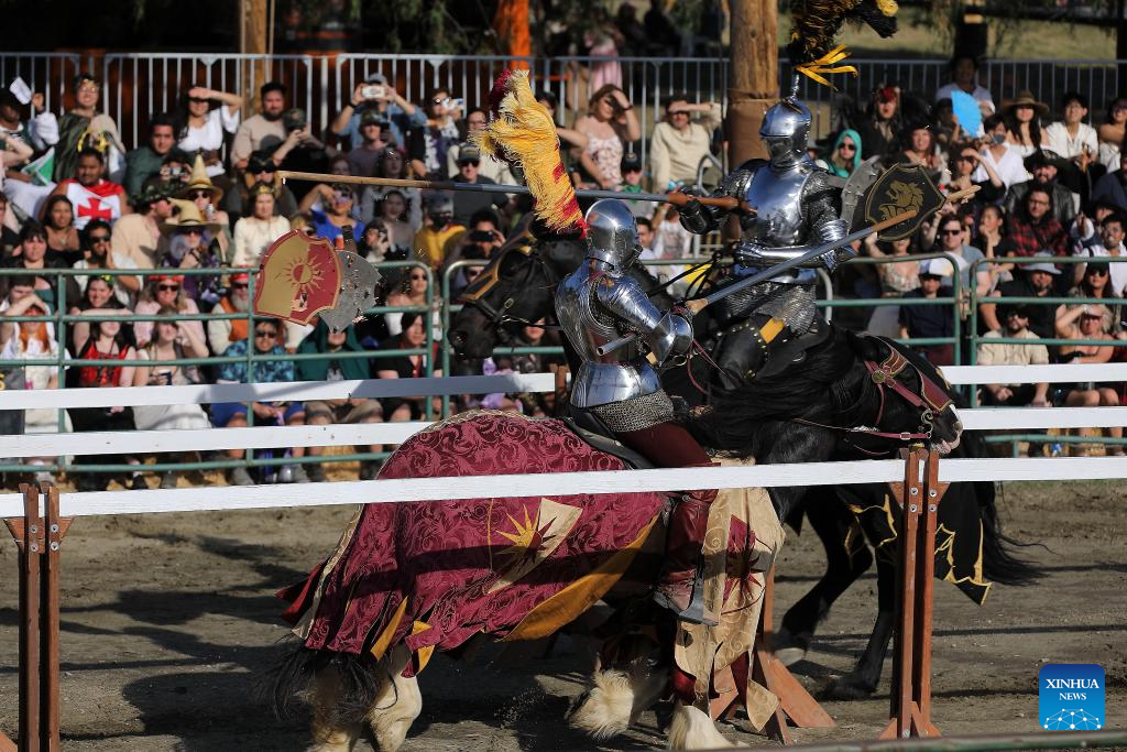 Jousters perform combating at the Renaissance Pleasure Faire in Irwindale, Los Angeles County, the United States, on April 20, 2025. (Photo by Qiu Chen/Xinhua)