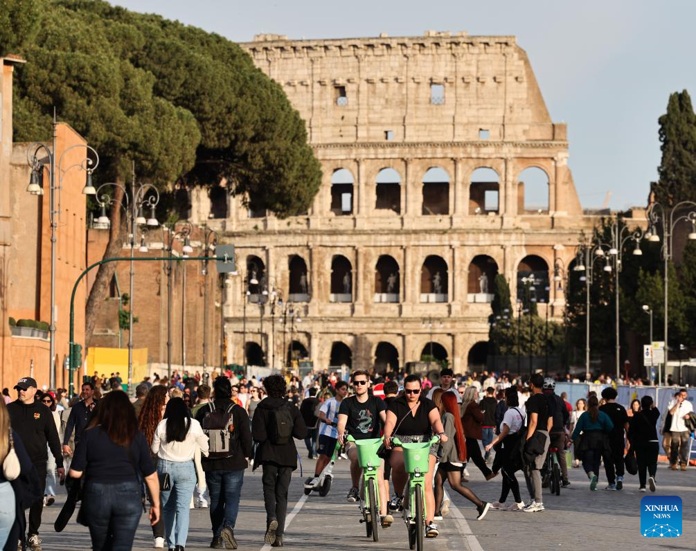 People visit Via dei Fori Imperiali in Rome, Italy, during the Easter holiday on April 21, 2025. (Xinhua/Li Jing)
