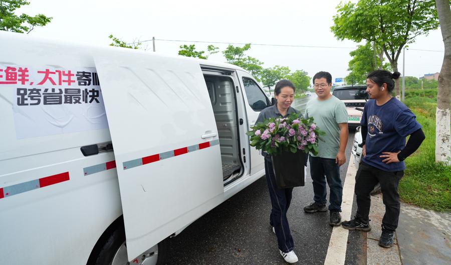 Zhan Juntao (1st R) packs Chinese roses for visitors at a Chinese rose production base in Longyou County, east China's Zhejiang Province, April 22, 2025. (Xinhua/Weng Xinyang)Liu Gang (L) instructs a farmer on picking Chinese roses at a Chinese rose production base in Longyou County, east China's Zhejiang Province, April 22, 2025. (Xinhua/Weng Xinyang)A staff member of a logistics company transports fresh-cut Chinese roses at a Chinese rose production base in Longyou County, east China's Zhejiang Province, April 22, 2025. (Xinhua/Weng Xinyang)
