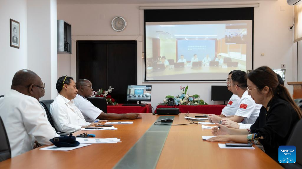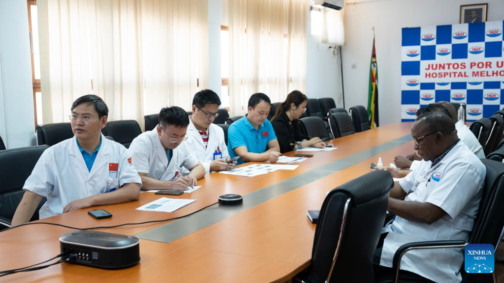 Members of the Chinese medical team stationed in Mozambique and department heads from surgery, orthopedics, and neurosurgery on the Mozambican side attend an international remote medical consultation between West China Hospital of Sichuan University and Maputo Central Hospital in Maputo, Mozambique, on April 21, 2025. A successful international remote medical consultation was held Monday between West China Hospital of Sichuan University and Maputo Central Hospital in Mozambique, as part of ongoing medical cooperation under the 25th Chinese medical team in the country. (Xinhua/Liu Jie)