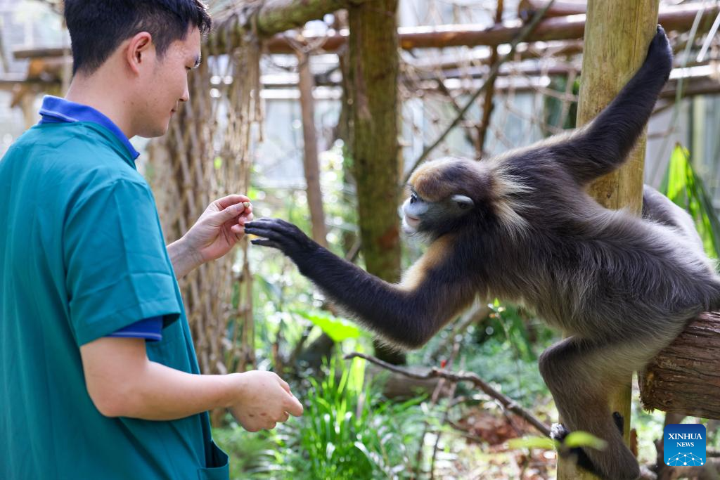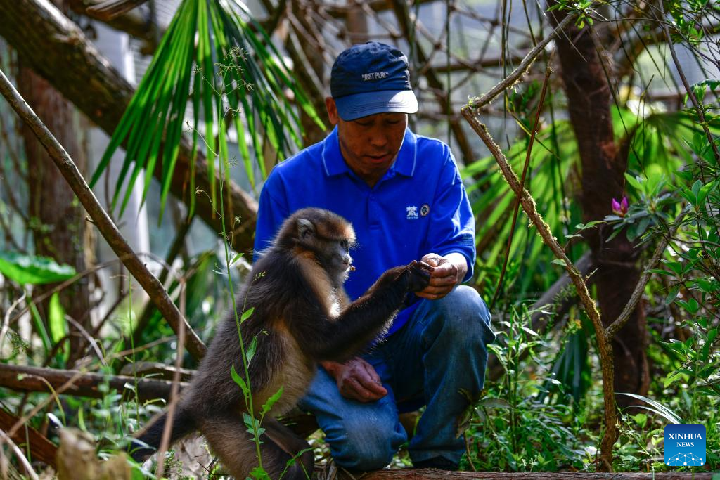 A keeper interacts with a Guizhou snub-nosed monkey in a Guizhou snub-nosed monkey research center of Mount Fanjing National Nature Reserve in southwest China's Guizhou Province, April 15, 2025. (Xinhua/Ou Dongqu)