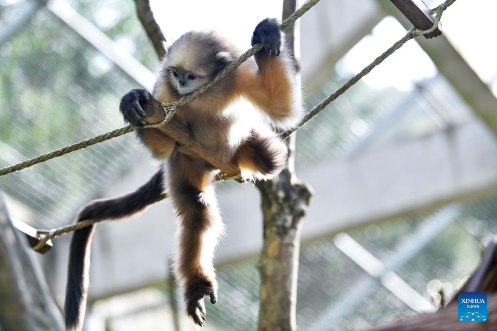 A Guizhou snub-nosed monkey is seen in a Guizhou snub-nosed monkey research center of Mount Fanjing National Nature Reserve in southwest China's Guizhou Province, April 15, 2025. (Xinhua/Yang Wenbin)
