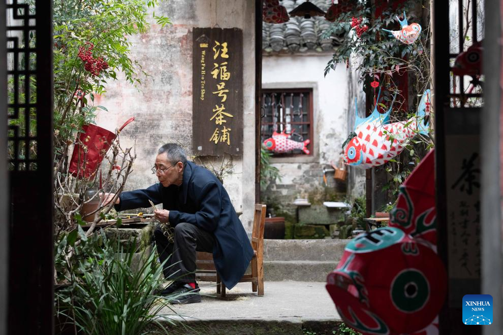 An artist makes a fish-shaped lantern at the Huizhou ancient town in Shexian County of Huangshan City, east China's Anhui Province, March 23, 2025. Located at the junction of Huangshan Mountains and Xin'an River, Shexian County of east China's Anhui Province has carried the essence of Hui-style culture and architecture. Huizhou Ancient City, lying at the heart of Shexian, is one of the best-preserved ancient towns in China. Its network of ancient streets, alleys, and bridges is complemented by traditional residences, ancestral halls, and memorial archways.