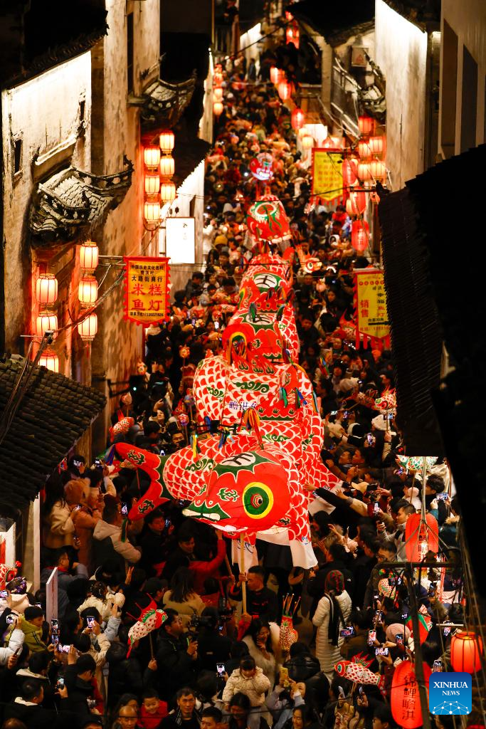 Visitors enjoy performance of fish-shaped lanterns in Zhanqi Village of Shexian County, Huangshan City, east China's Anhui Province, Dec. 31, 2024. Located at the junction of Huangshan Mountains and Xin'an River, Shexian County of east China's Anhui Province has carried the essence of Hui-style culture and architecture. Huizhou Ancient City, lying at the heart of Shexian, is one of the best-preserved ancient towns in China. Its network of ancient streets, alleys, and bridges is complemented by traditional residences, ancestral halls, and memorial archways.