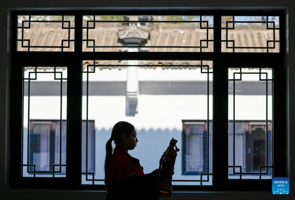 A student observes a woodcarving work during a practical training class at a school in Shexian County of Huangshan City, east China's Anhui Province, Nov. 27, 2024. Located at the junction of Huangshan Mountains and Xin'an River, Shexian County of east China's Anhui Province has carried the essence of Hui-style culture and architecture. Huizhou Ancient City, lying at the heart of Shexian, is one of the best-preserved ancient towns in China. Its network of ancient streets, alleys, and bridges is complemented by traditional residences, ancestral halls, and memorial archways.