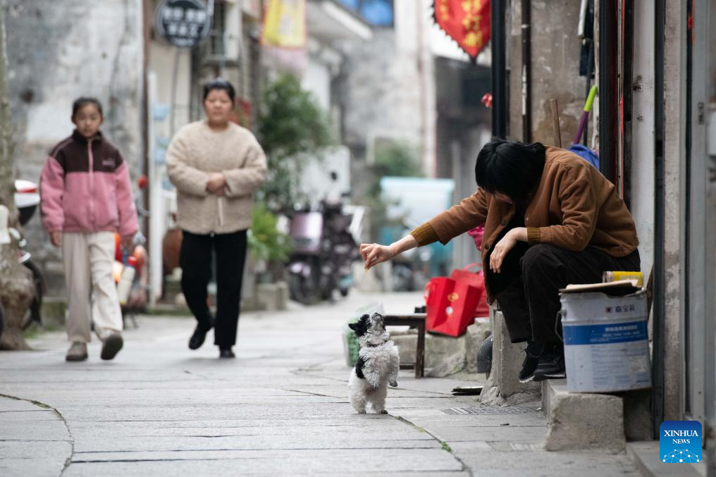 A resident interacts with a dog at the Huizhou ancient town in Shexian County of Huangshan City, east China's Anhui Province, March 23, 2025. Located at the junction of Huangshan Mountains and Xin'an River, Shexian County of east China's Anhui Province has carried the essence of Hui-style culture and architecture. Huizhou Ancient City, lying at the heart of Shexian, is one of the best-preserved ancient towns in China. Its network of ancient streets, alleys, and bridges is complemented by traditional residences, ancestral halls, and memorial archways.