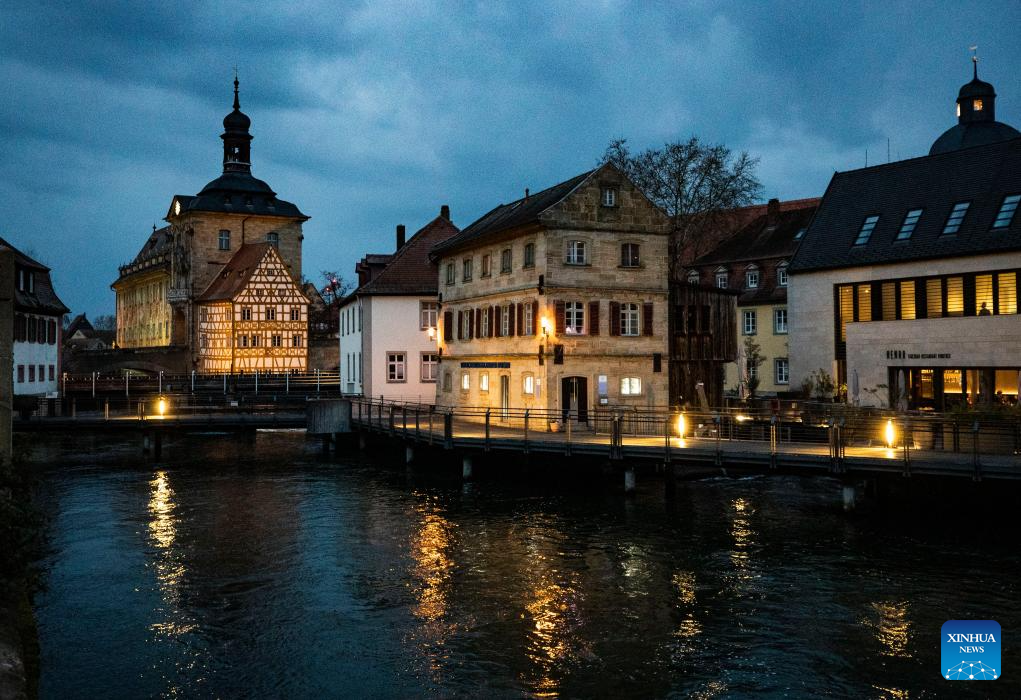 This photo taken on March 24, 2025 shows the night view of the ancient town of Bamberg in Bavarian state, Germany. Bamberg in Germany and Shexian in China show how towns with a remarkable history can thrive today.