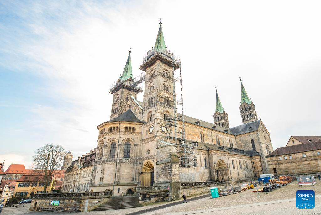 This photo taken on March 24, 2025 shows a view of the Bamberger Dom in the ancient town of Bamberg in Bavarian state, Germany. Bamberg in Germany and Shexian in China show how towns with a remarkable history can thrive today.