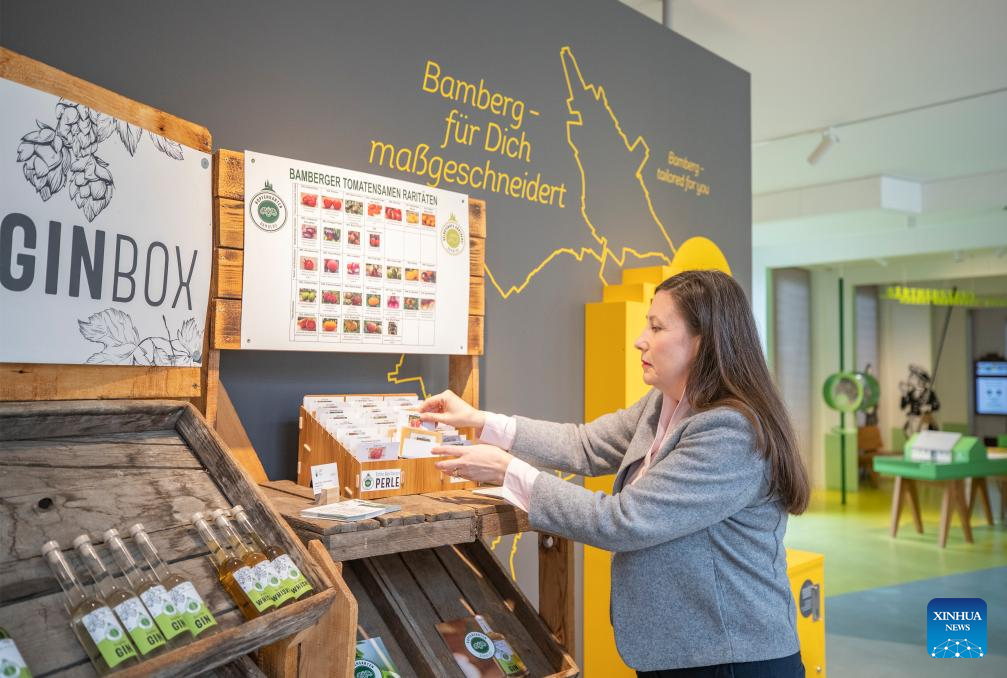 Simona von Eyb, director of the World Heritage Center Bamberg, introduces Bamberg's featured products in the ancient town of Bamberg, Germany, March 24, 2025. (Xinhua/Zhang Fan)