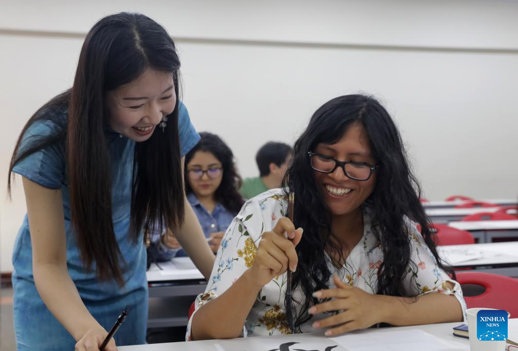 Liang Qing (L), a Chinese language teacher at the Confucius Institute of the Pontifical Catholic University of Peru, instructs a Peruvian student in writing Chinese calligraphy in Lima, capital of Peru, April 22, 2025. A series of activities to celebrate the International Chinese Language Day was held here on Tuesday by the Pontifical Catholic University of Peru. (Photo by Mariana Bazo/Xinhua)