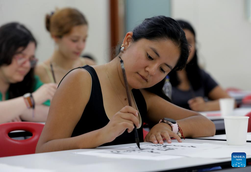 Peru students learn Chinese calligraphy at the Confucius Institute of the Pontifical Catholic University of Peru in Lima, capital of Peru, April 22, 2025. A series of activities to celebrate the International Chinese Language Day was held here on Tuesday by the Pontifical Catholic University of Peru. (Photo by Mariana Bazo/Xinhua)