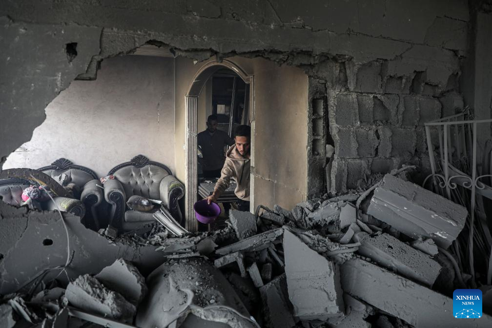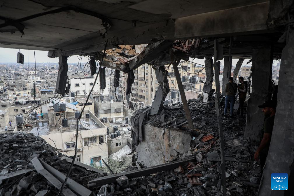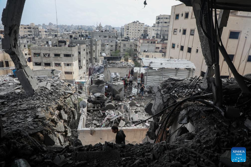 Palestinians inspect a destroyed apartment building after an Israeli airstrike in Gaza City, on April 24, 2025. At least 29 Palestinians were killed on Thursday in multiple Israeli airstrikes across the Gaza Strip, according to Gaza's civil defense. (Xinhua/Rizek Abdeljawad)
