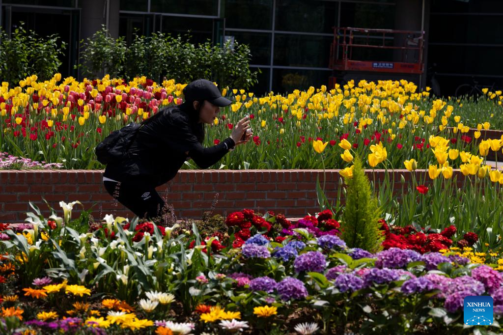A visitor takes photos during a media preview of International Horticulture Goyang Korea, an international flower exhibition, in Goyang, Gyeonggi Province of South Korea, on April 24, 2025. The exhibition will be held from April 25 to May 11 here this year. (Photo by Jun Hyosang/Xinhua)