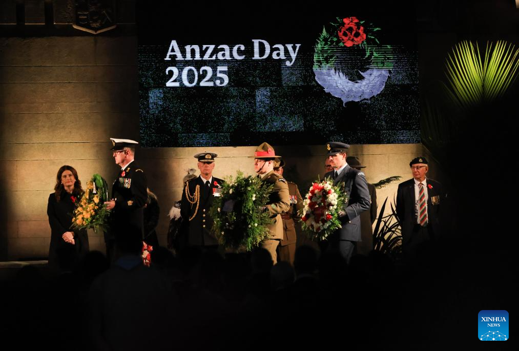 This photo taken on April 25, 2025 shows a scene of the Anzac Day memorial in Wellington, New Zealand. Anzac Day, which falls on April 25, marks the anniversary of the first major military action fought by Australian and New Zealand Army Corps (Anzac) in World War I on Turkey's Gallipoli Peninsula in 1915. (Photo by Meng Tao/Xinhua)