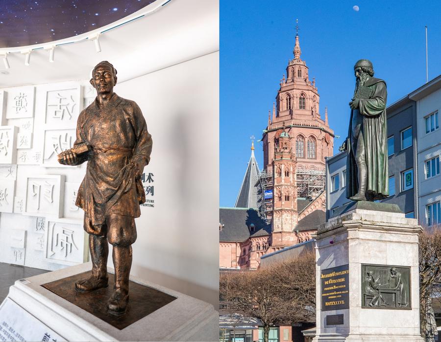 LEFT: This photo taken by Xinhua photographer Xiao Yijiu on April 2, 2025 shows a statue of Bi Sheng at the Bi Sheng Memorial Hall in Yingshan County, central China's Hubei Province; RIGHT: This photo taken by Xinhua photographer Zhang Fan on April 7, 2025 shows a statue of Johannes Gutenberg in Mainz, Germany. (Xinhua)