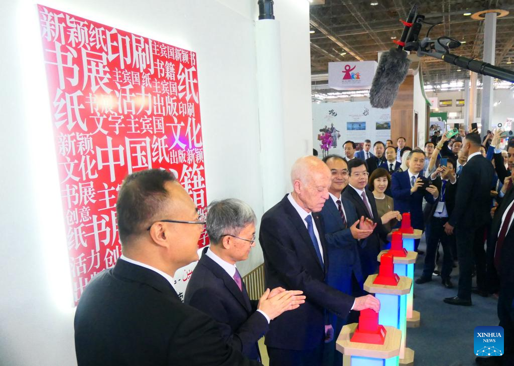 Tunisian President Kais Saied (3rd L) attends a launching ceremony of China's guest of honor at the 39th edition of Tunis International Book Fair in Tunis, Tunisia, on April 25, 2025. The 39th Tunis International Book Fair kicked off here on Friday, with China as the guest of honor, presenting a diverse collection of Chinese publications. (Xinhua/Huang Ling)