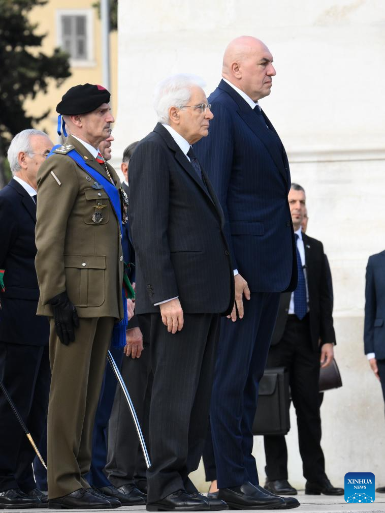 Italian President Sergio Mattarella (C) attends a wreath-laying ceremony to mark 80th anniversary of Liberation Day at the Tomb of the Unknown Soldier in Rome, Italy, on April 25, 2025. Italy marked the 80th anniversary of its liberation from fascism on Friday with a range of activities across the country. (Photo by Alberto Lingria/Xinhua)