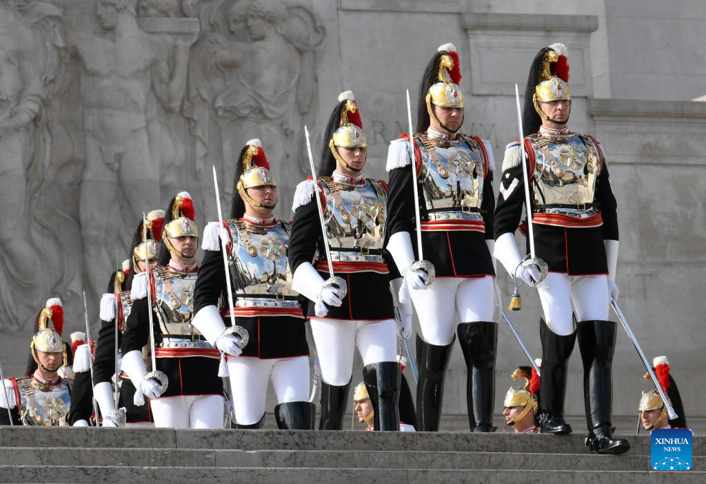 Italian guard of honour march on steps of the Vittoriano Monument during a ceremony to mark 80th anniversary of Liberation Day in Rome, Italy, on April 25, 2025. Italy marked the 80th anniversary of its liberation from fascism on Friday with a range of activities across the country. (Photo by Alberto Lingria/Xinhua)
