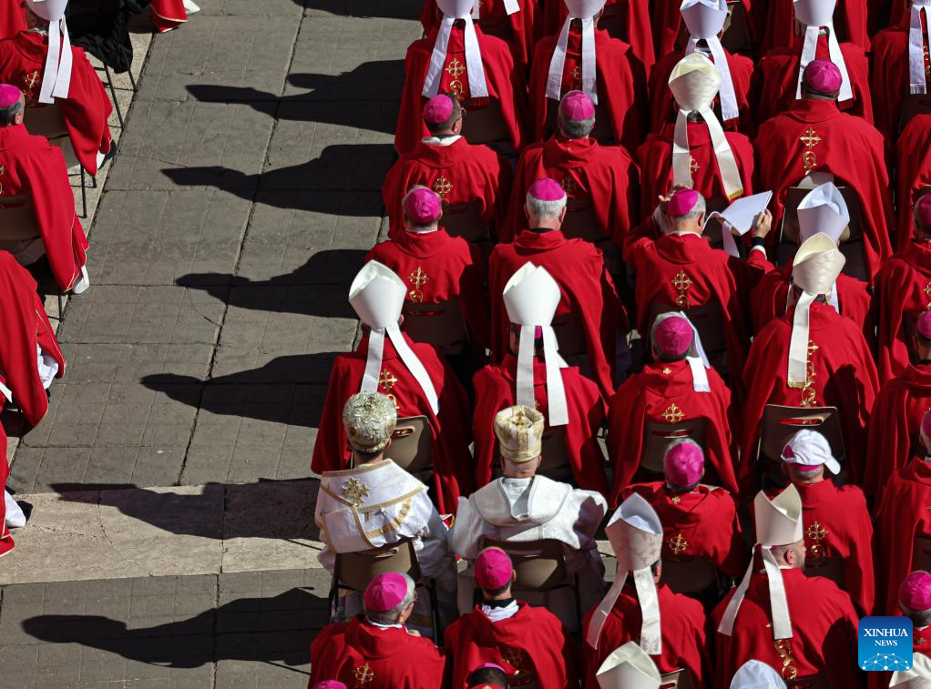 Members of the clergy attend Pope Francis's funeral at St. Peter's Square in Vatican on April 26, 2025. Pope Francis, the 266th pontiff of the Roman Catholic Church, died Monday at the age of 88. (Xinhua/Li Jing)