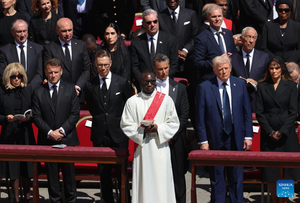 This photo taken on April 26, 2025 shows a scene during Pope Francis's funeral at St. Peter's Square in Vatican. Pope Francis, the 266th pontiff of the Roman Catholic Church, died Monday at the age of 88. (Xinhua/Li Jing)