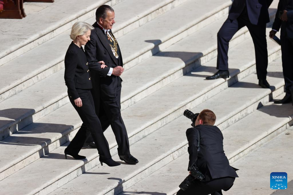 European Commission President Ursula von der Leyen (L) arrives for Pope Francis's funeral at St. Peter's Square in Vatican on April 26, 2025. Pope Francis, the 266th pontiff of the Roman Catholic Church, died Monday at the age of 88. (Xinhua/Li Jing)