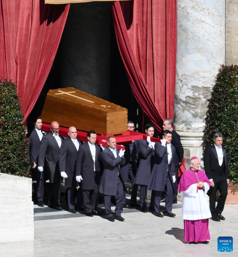 Cardinal Giovanni Battista Re blesses the coffin as he leads Pope Francis's funeral at St. Peter's Square in Vatican on April 26, 2025. Pope Francis, the 266th pontiff of the Roman Catholic Church, died Monday at the age of 88. (Xinhua/Li Jing)