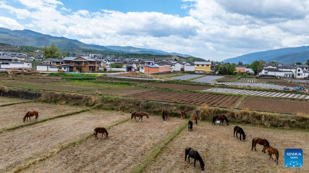 An aerial drone photo taken on April 20, 2025 shows horses foraging in the field at Sideng Village of Shaxi Town, Jianchuan County, southwest China's Yunnan Province. A remote town in Jianchuan County, Shaxi was once an important trading hub for tea, herbs, silks and salt on the ancient Tea Horse Road, a trade route dating back to the Tang Dynasty (618-907).