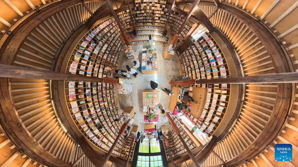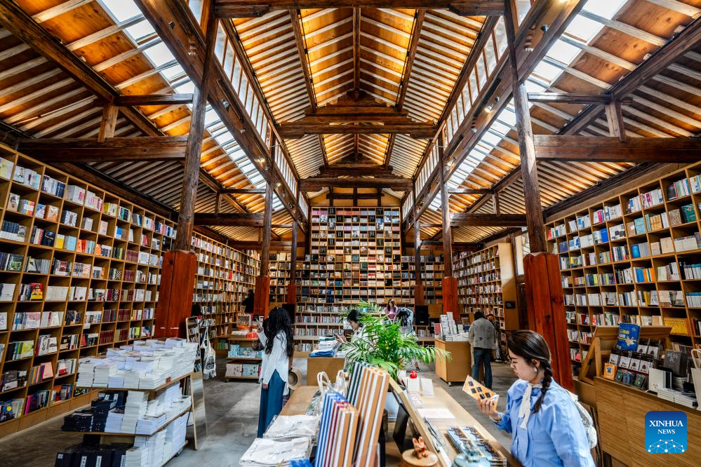 People visit a bookshop at Beilong Village of Shaxi Town, Jianchuan County, southwest China's Yunnan Province, April 20, 2025. A remote town in Jianchuan County, Shaxi was once an important trading hub for tea, herbs, silks and salt on the ancient Tea Horse Road, a trade route dating back to the Tang Dynasty (618-907).