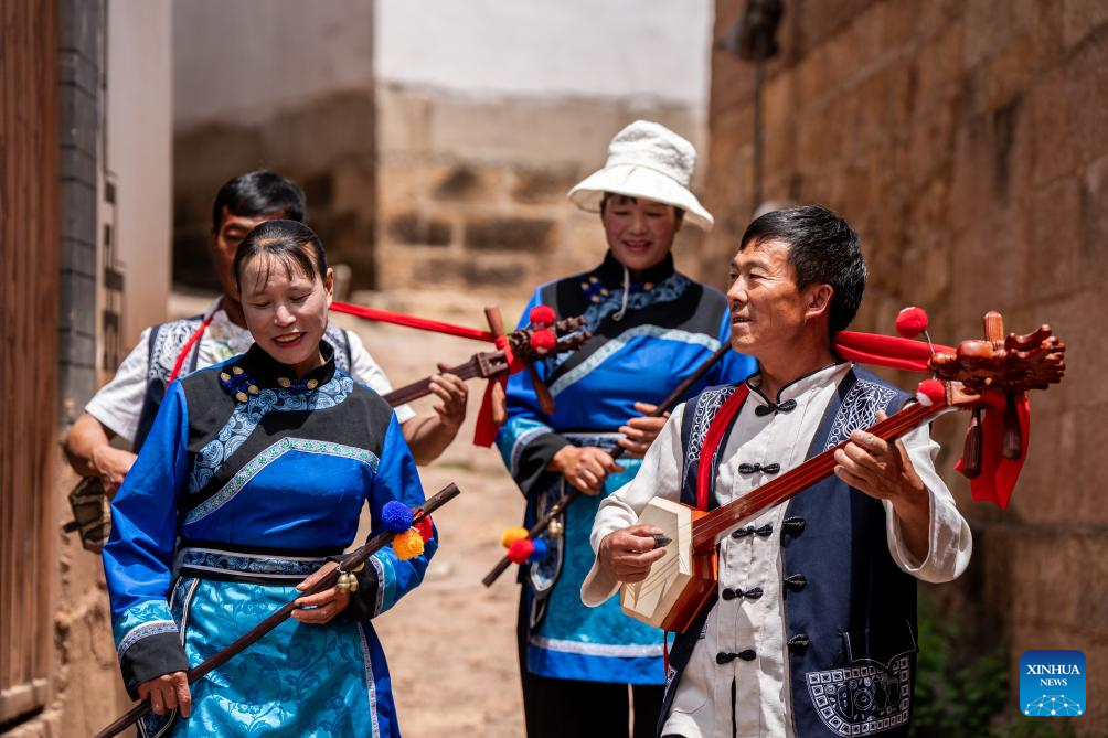 Jiang Wufa (2nd, R), an inheritor of arts for Shibaoshan Song Festival, a national intangible cultural heritage, rehearses with his apprentices in Shilong Village of Shaxi Town, Jianchuan County, southwest China's Yunnan Province, April 19, 2025. A remote town in Jianchuan County, Shaxi was once an important trading hub for tea, herbs, silks and salt on the ancient Tea Horse Road, a trade route dating back to the Tang Dynasty (618-907).