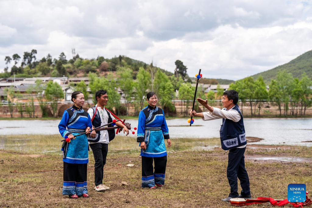 Jiang Wufa (R), an inheritor of arts for Shibaoshan Song Festival, a national intangible cultural heritage, instructs his apprentices during rehearsal in Shilong Village of Shaxi Town, Jianchuan County, southwest China's Yunnan Province, April 19, 2025. A remote town in Jianchuan County, Shaxi was once an important trading hub for tea, herbs, silks and salt on the ancient Tea Horse Road, a trade route dating back to the Tang Dynasty (618-907).