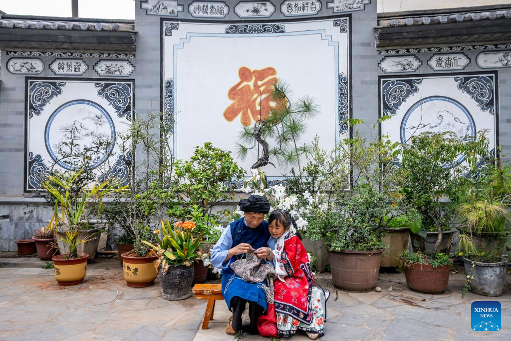 An elderly woman of Bai ethnic group makes embroidered sachets in Hualong Village of Shaxi Town, Jianchuan County, southwest China's Yunnan Province, April 20, 2025. A remote town in Jianchuan County, Shaxi was once an important trading hub for tea, herbs, silks and salt on the ancient Tea Horse Road, a trade route dating back to the Tang Dynasty (618-907).