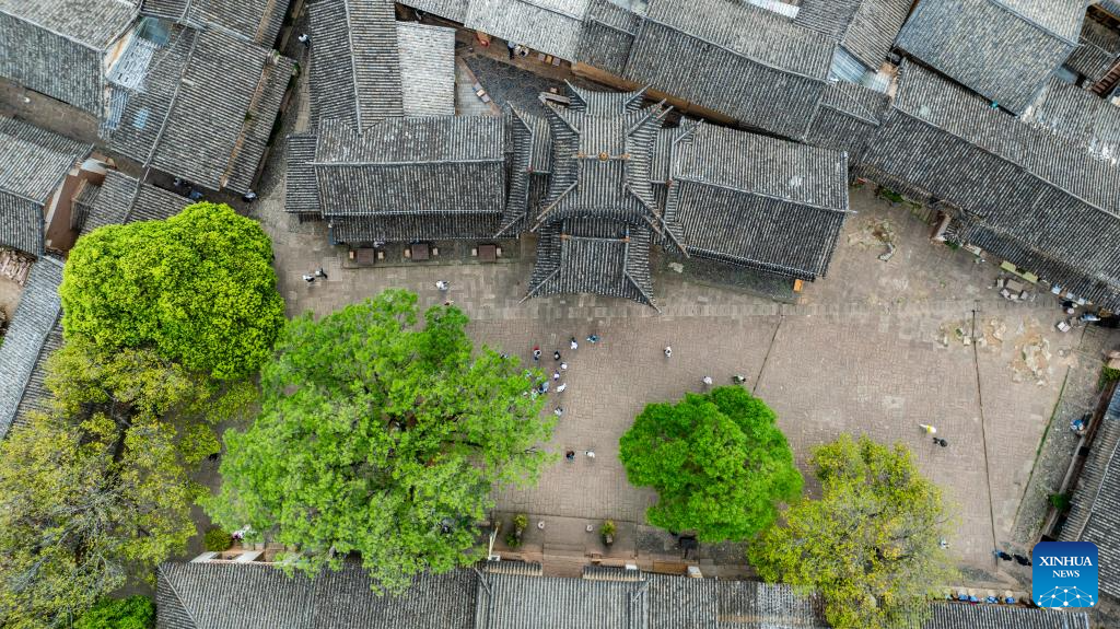 An aerial drone photo taken on April 19, 2025 shows a historical building that used to be a hostel at Sideng Village of Shaxi Town, Jianchuan County, southwest China's Yunnan Province. A remote town in Jianchuan County, Shaxi was once an important trading hub for tea, herbs, silks and salt on the ancient Tea Horse Road, a trade route dating back to the Tang Dynasty (618-907).