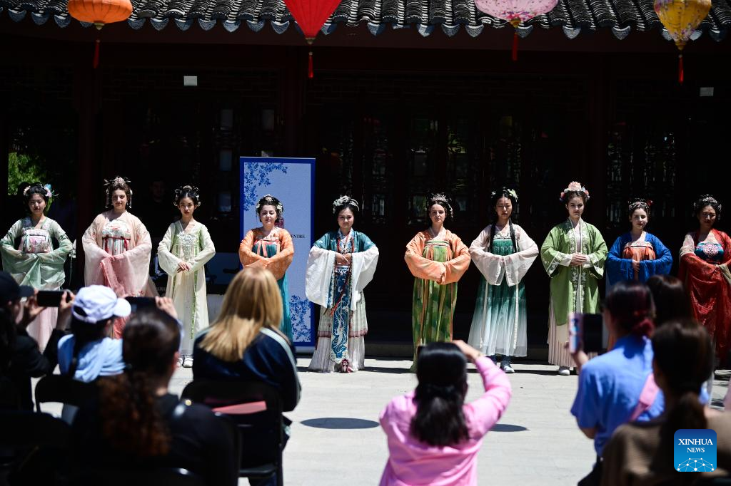 People watch a traditional Chinese costume showcase at the Garden of Serenity in Santa Lucija, Malta, on April 27, 2025.(Photo by Jonathan Borg/Xinhua)