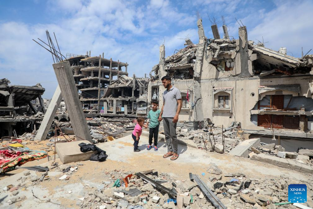 Palestinian child Ahmed Khaled Hijazi (C) is pictured among the rubble in the town of Beit Lahia, northern Gaza Strip, April 27, 2025.