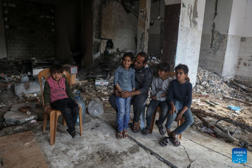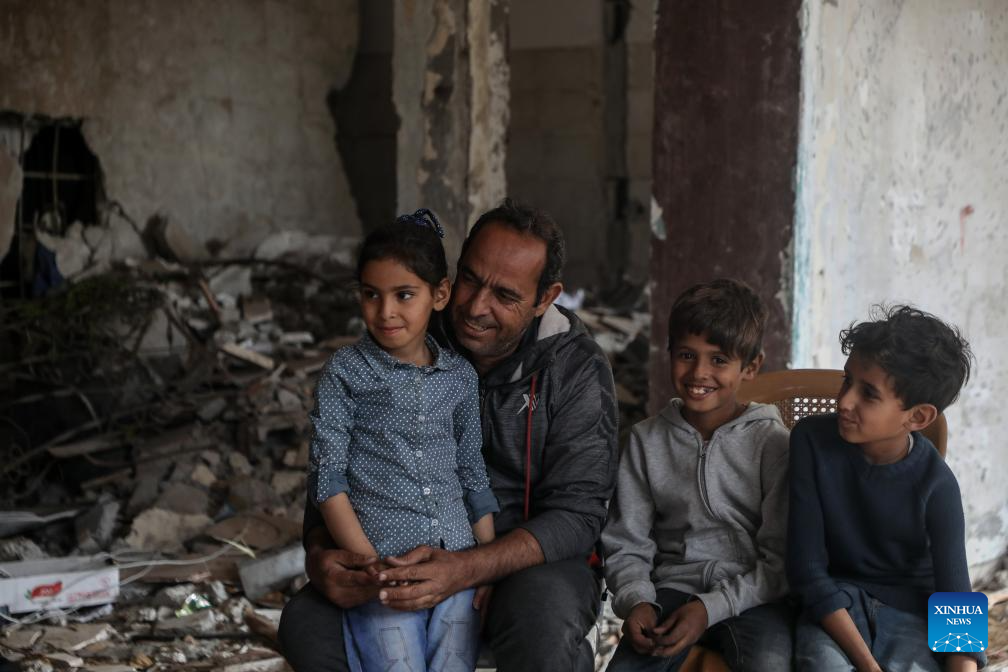 Akram Abu Khosa, a 49-year-old Palestinian farmer, and his children are seen at their damaged house in Tal al-Hawa, west of Gaza City, on April 28, 2025. In Tal al-Hawa, Akram Abu Khosa often sits quietly on his balcony. With his smartphone in hand, he scrolls through photos and videos of his once-vibrant strawberry fields. "Just two years ago, I would breathe the fresh air every morning amidst the fields. But now, I am forced to look at the devastation around me and remember my farm only through videos and photos," the father of six told Xinhua. (Photo by Rizek Abdeljawad/Xinhua)