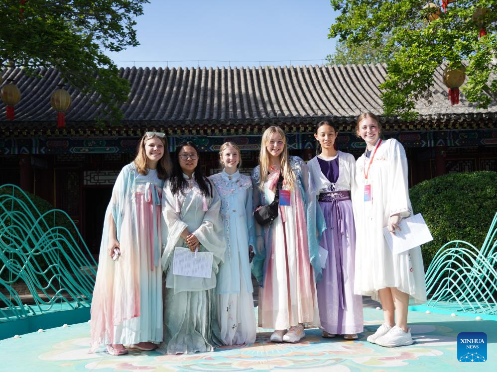 Students from China and the United States dressed in Chinese-style costumes pose for a group photo in Shijiazhuang, north China's Hebei Province, April 27, 2025. (Shijiazhuang Foreign Language School/Handout via Xinhua)