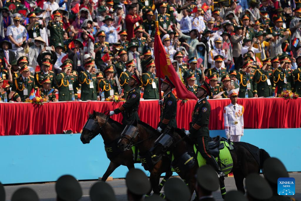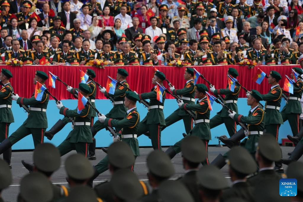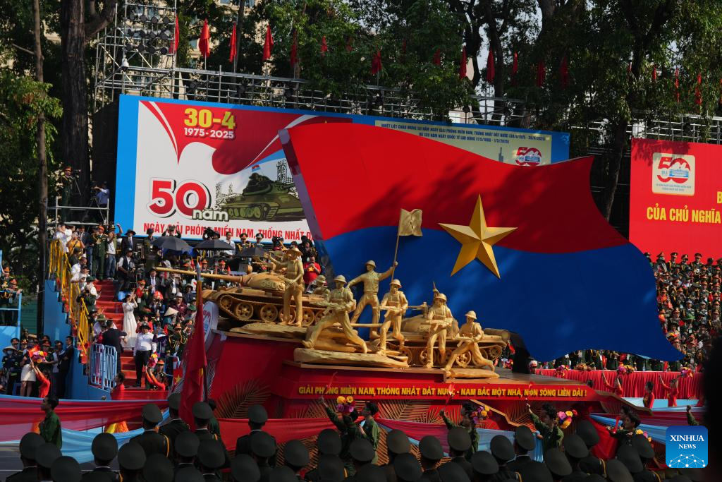 This photo taken on April 30, 2025 shows a scene of a mass march marking the 50th anniversary of the liberation of the South and national reunification in Ho Chi Minh City, Vietnam. Vietnam on Wednesday held a grand ceremony, military parade and mass march in Ho Chi Minh City to mark the 50th anniversary of the liberation of the South and national reunification. Vietnamese leaders, including General Secretary of the Communist Party of Vietnam Central Committee To Lam, President Luong Cuong, Prime Minister Pham Minh Chinh and Chairman of the National Assembly Tran Thanh Man, attended the event along with representatives from various sectors. (Xinhua/Hu Jiali)