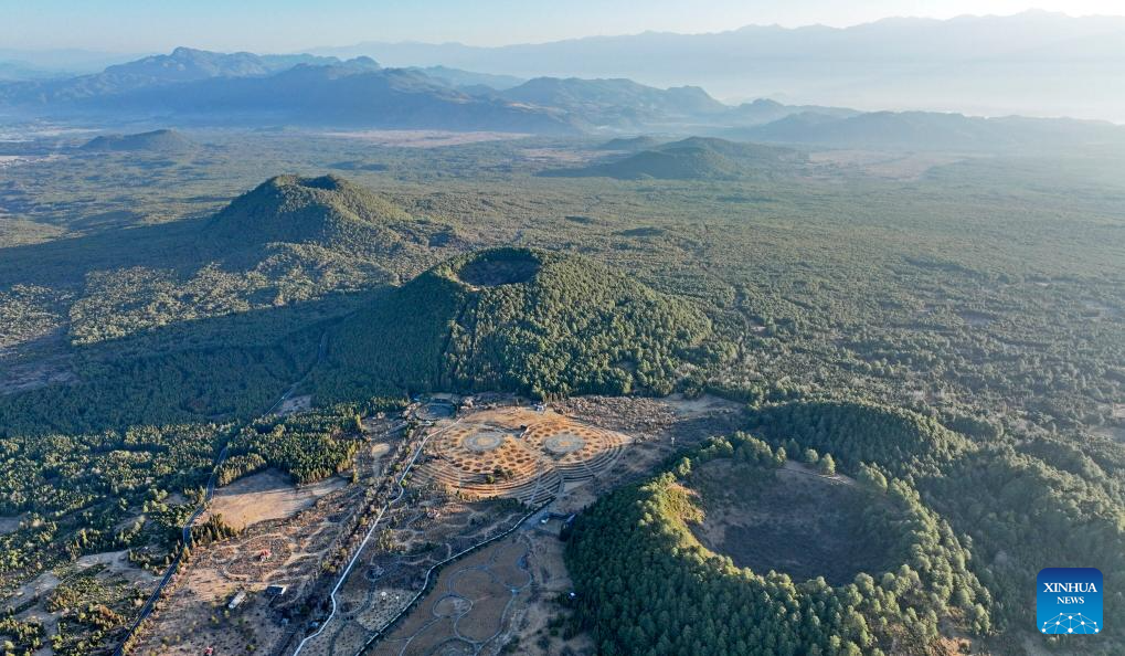 An aerial drone photo taken on Dec. 22, 2023 shows volcanoes in a national geological park in Tengchong, southwest China's Yunnan Province. Home to 99 active and extinct volcanoes, Tengchong is rich in geothermal resources. The city's environment is known by locals as being "half water half fire," a feature that has been utilized to develop tourism. (Photo by Zhao Hui/Xinhua)