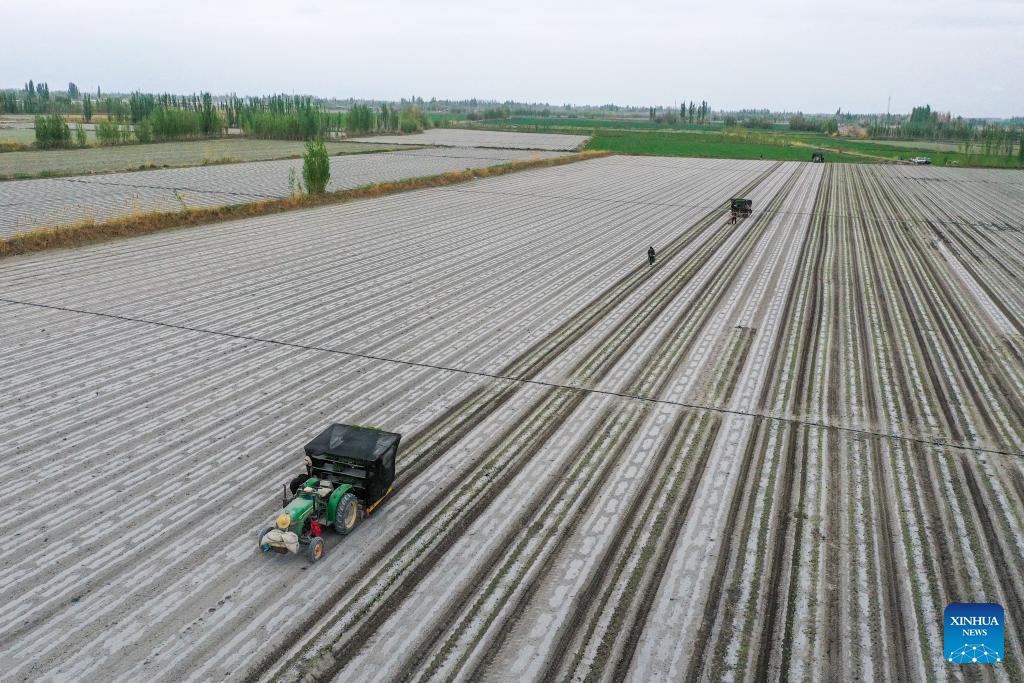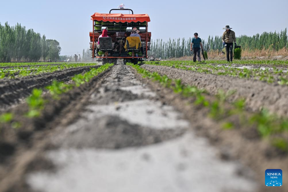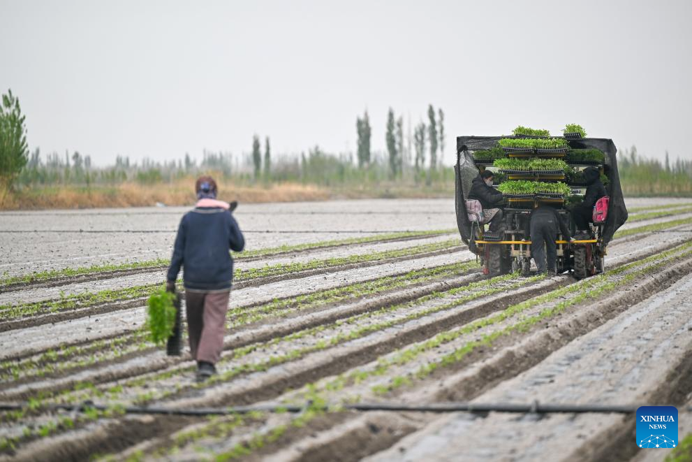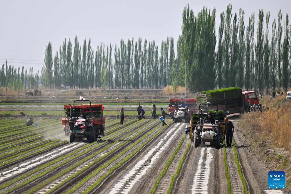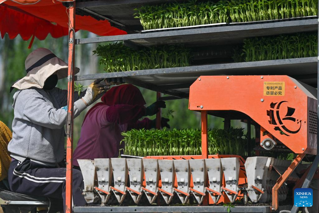 Transplanting machines work in a red pepper field in Bumbut Town, Mongolian Autonomous Prefecture of Bayingolin in northwest China's Xinjiang Uygur Autonomous Region, April 29, 2025. The application of mechanized, intelligent and automated equipment improves the efficiency of local tomato and red pepper planting. (Xinhua/Ding Lei)