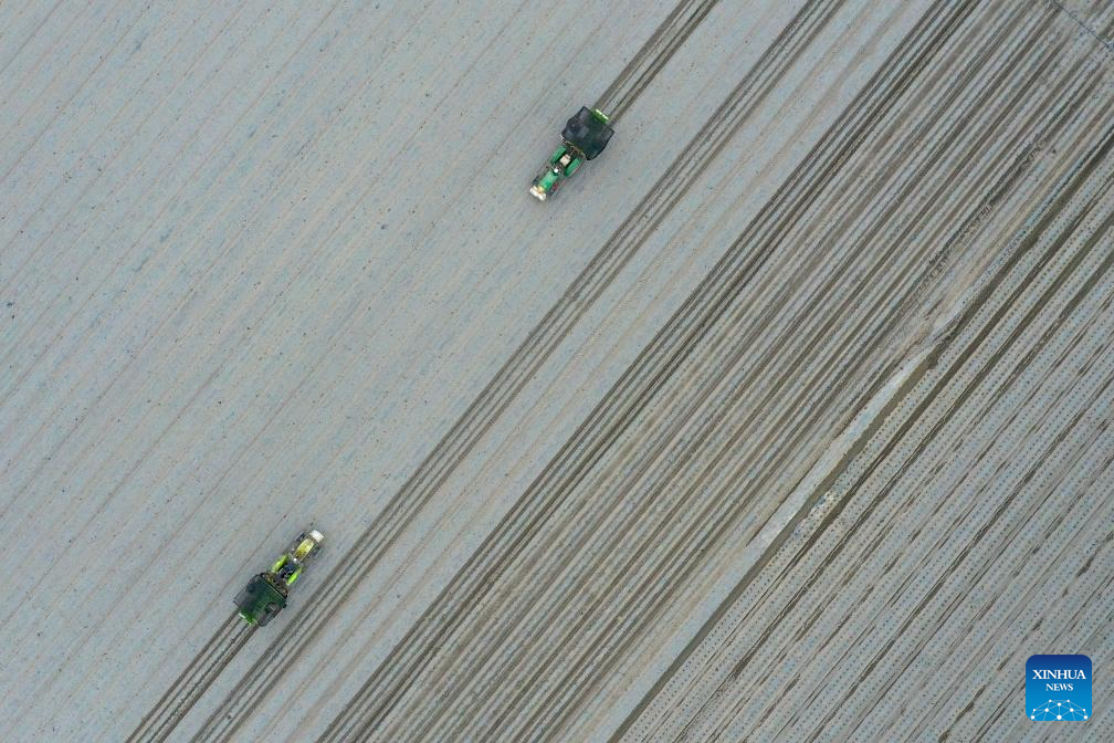 An aerial drone photo taken on April 28, 2025 shows transplanting machines working in a red pepper field in Bumbut Town, Mongolian Autonomous Prefecture of Bayingolin in northwest China's Xinjiang Uygur Autonomous Region. The application of mechanized, intelligent and automated equipment improves the efficiency of local tomato and red pepper planting. (Xinhua/Ding Lei)