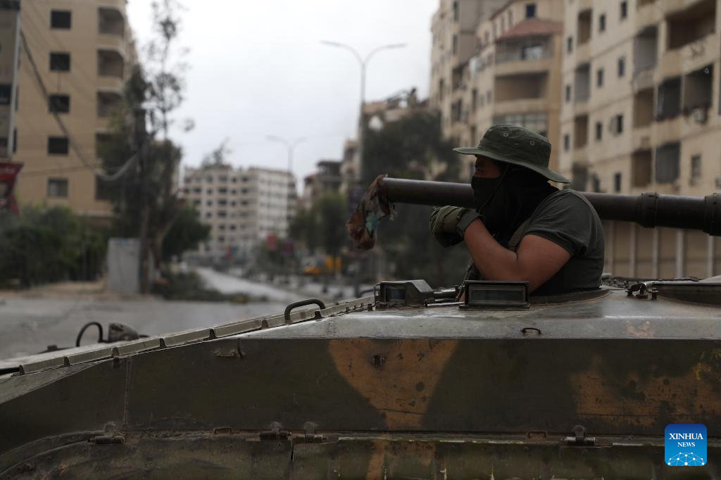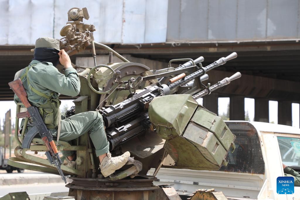 A Syrian security member is seen on a military vehicle in the town of Ashrafiyat Sahnaya, southwest of Damascus, Syria, on April 30, 2025. (Str/Xinhua)